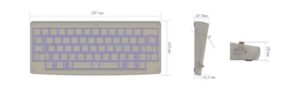 As with other 60% keyboards, Agar’s footprint is relatively compact, measuring 297 mm by 123 mm. The keyboard’s front is about 15.2 tall and arches upwards to the 32.9 mm back. Agar has a 9° typing angle.