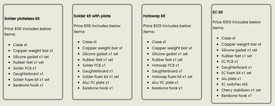 Agar comes in four different kits: a solder plateless kit, a solder kit with plate, a hotswap kit, and an EC kit. The solder plateless kit is the least expensive kit ($110) followed by the solder kit with plate ($115), hotswap kit ($125), and EC kit ($159). The EC kit comes with switches, but the other kits do not, and none of the kits include keycaps or stablizers. You can also buy just the case without any of the other parts or accessories.