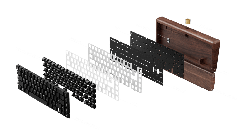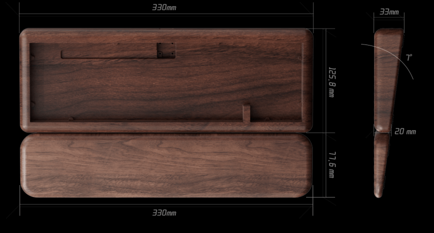Dusk67 has a case entirely made of walnut wood, and it has a small golden accent around the USB-C port. It is 300mm wide and 125.8mm deep, its lowest point is 20mm tall, and its highest point is 33mm tall. Its typing angle is 7°, and it has a 1.6mm non-flex-cut ANSI or ISO PCB with a caps lock LED indicator, or a 1.2mm ANSI PCB, with a daughter board. Its PCB supports VIA, and buyers have a choice of aluminum, carbon fiber, FR4, or polycarbonate non-flex-cut plates. KBDFans offers a 330mm x 77.6mm matching wrist rest for an additional $15.
