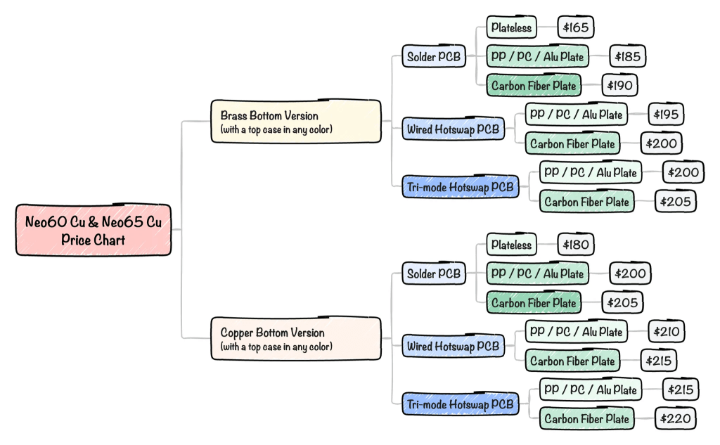 Within the Neo brand, there are three series: the Neo series — Neo98, Neo75, Neo Ergo, Neo65, and Neo65 Sonic HE+; the Core series — Neo60 Core, Neo66 Core Plus; and the Cu series — Neo60 Cu, Neo65 Cu, Neo75 Cu, and Neo80 Cu. The Cu series is the most premium and the newest of the Neo keyboards due to the availability of brass and copper bottom cases.